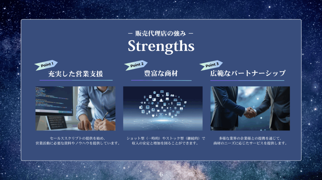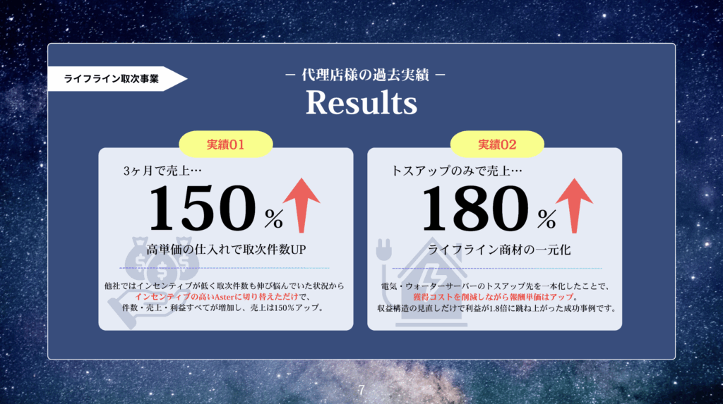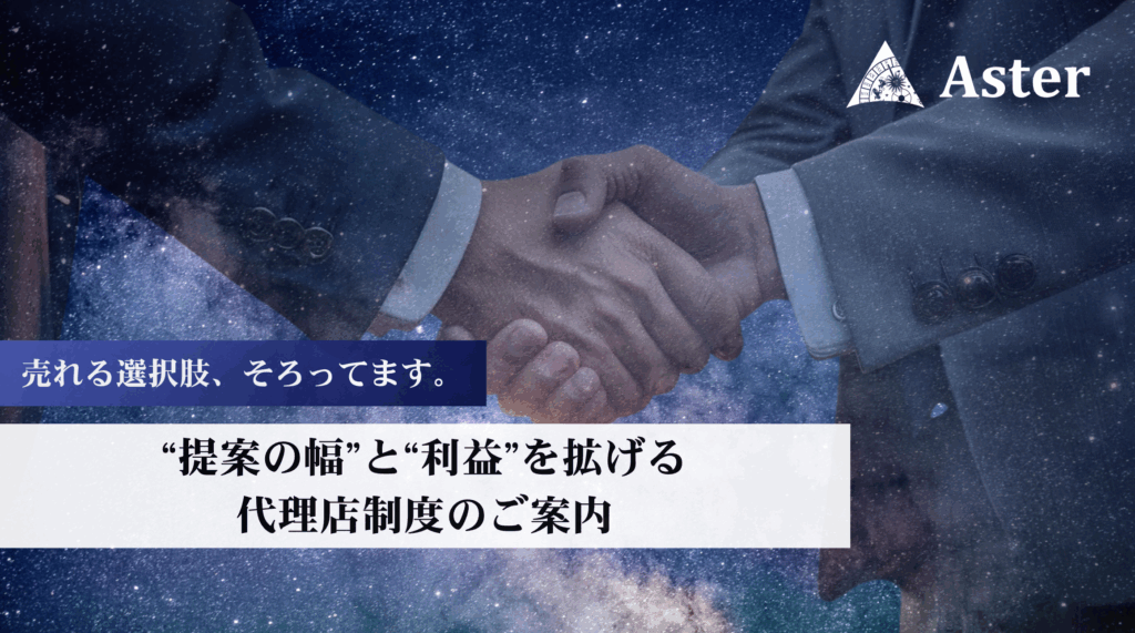 株式会社Asterの「販売代理店制度」の概要資料です。豊富な商材ラインナップと高利益モデルにより、ショット型・ストック型の両面で安定した収益を実現できます。実際に売上150%アップを達成した事例も掲載しています。